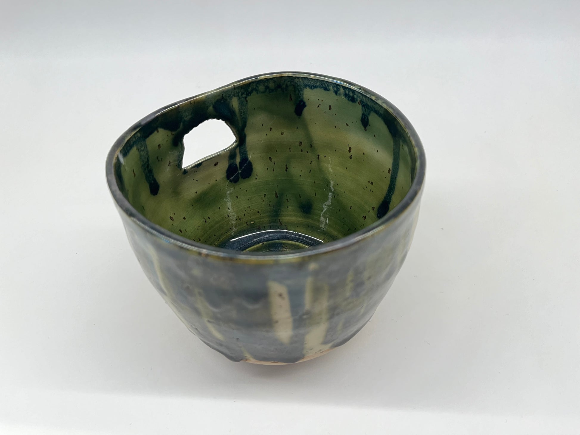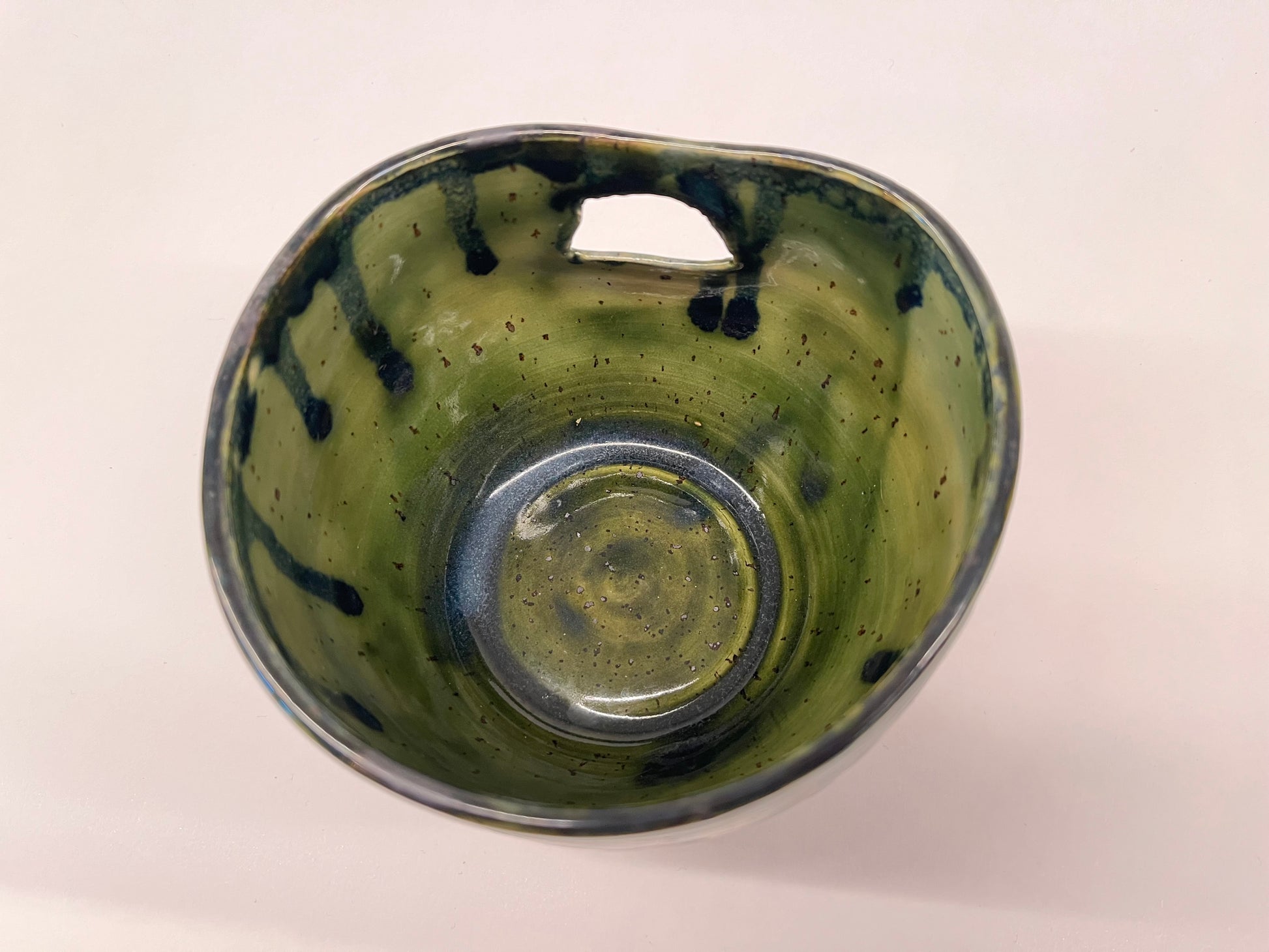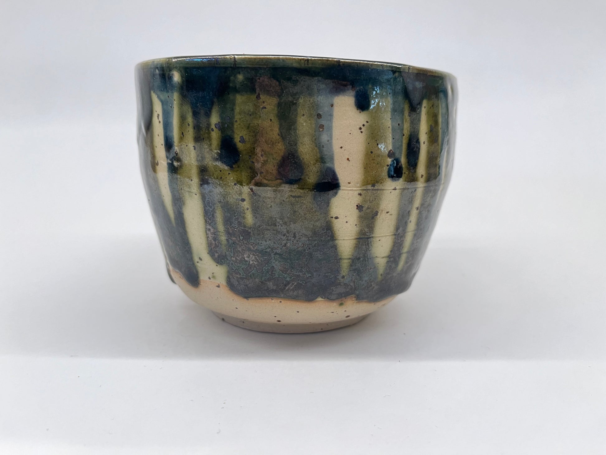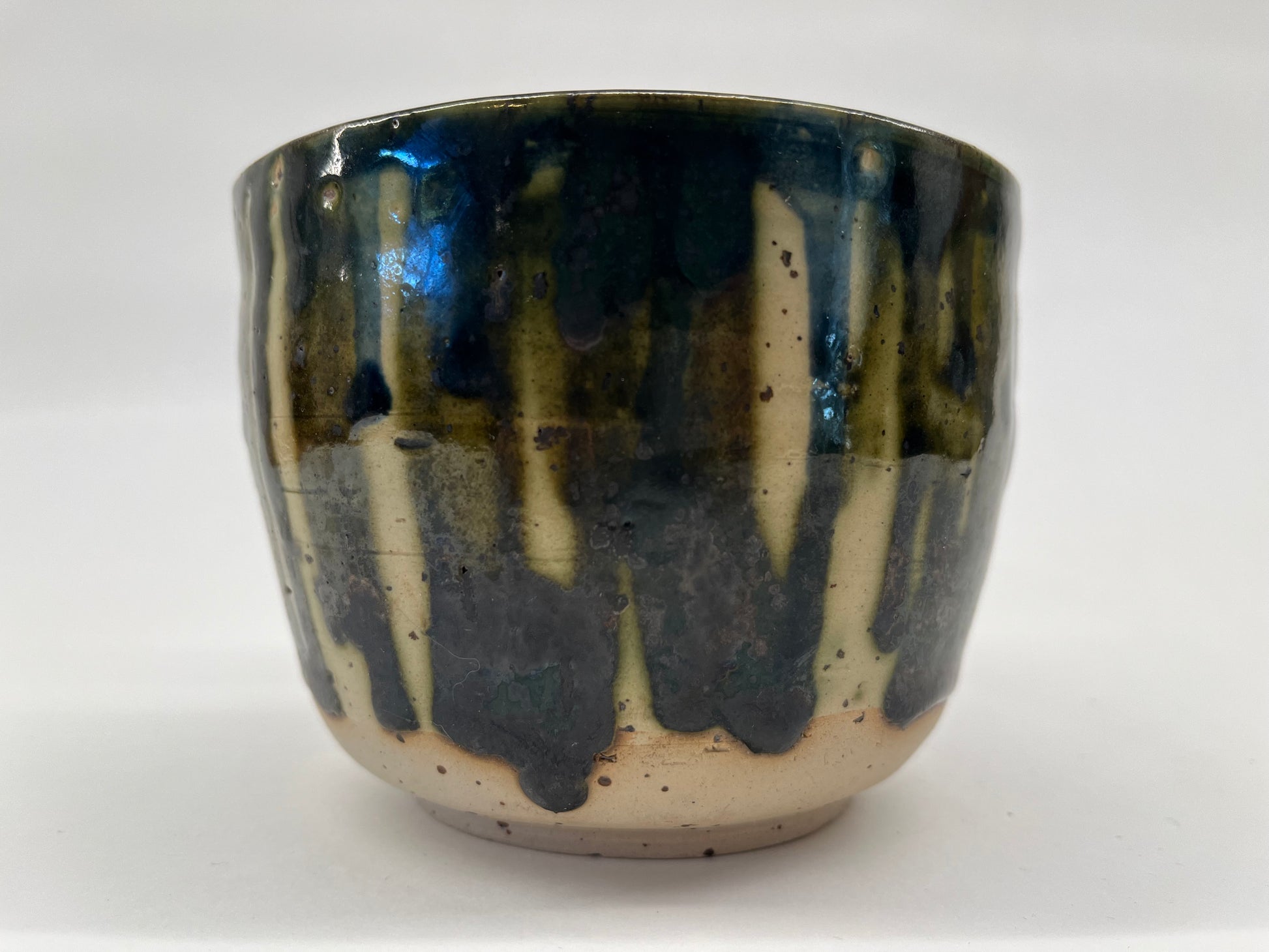 Drippy-glazed wall planter for small wall-hanging plants. Can hold plastic inner pots up to 10cm diameter. Dishwasher safe glaze.