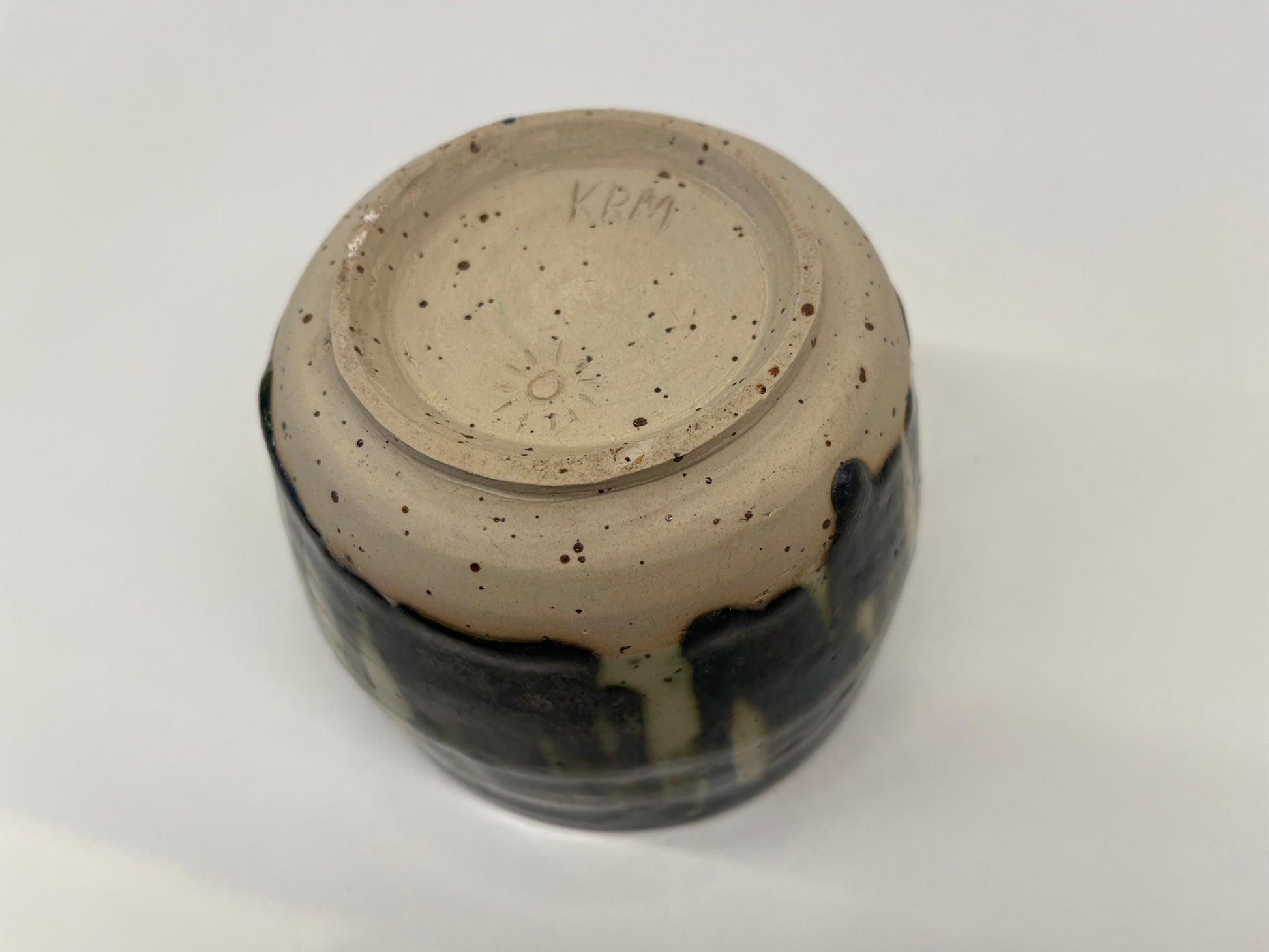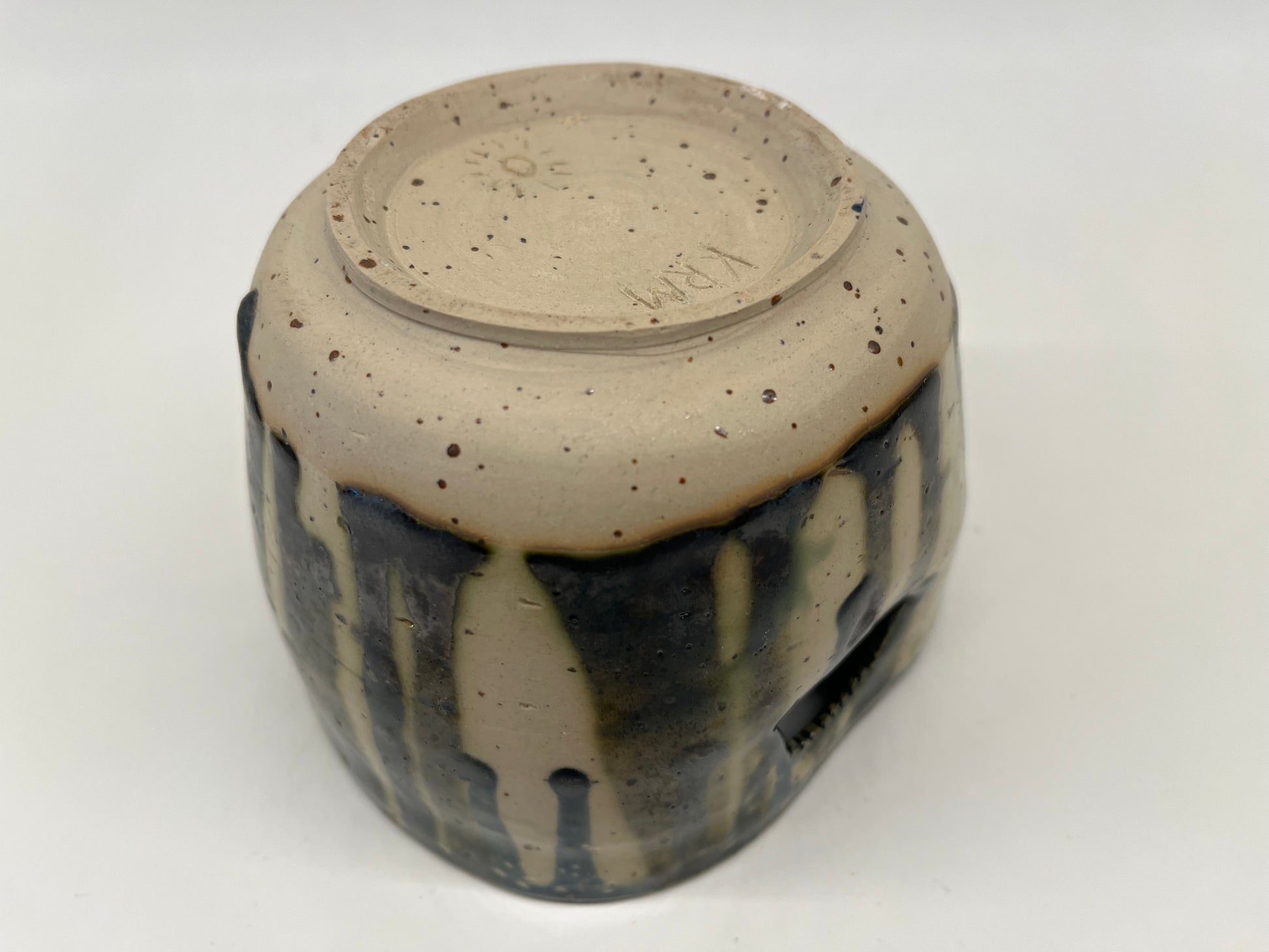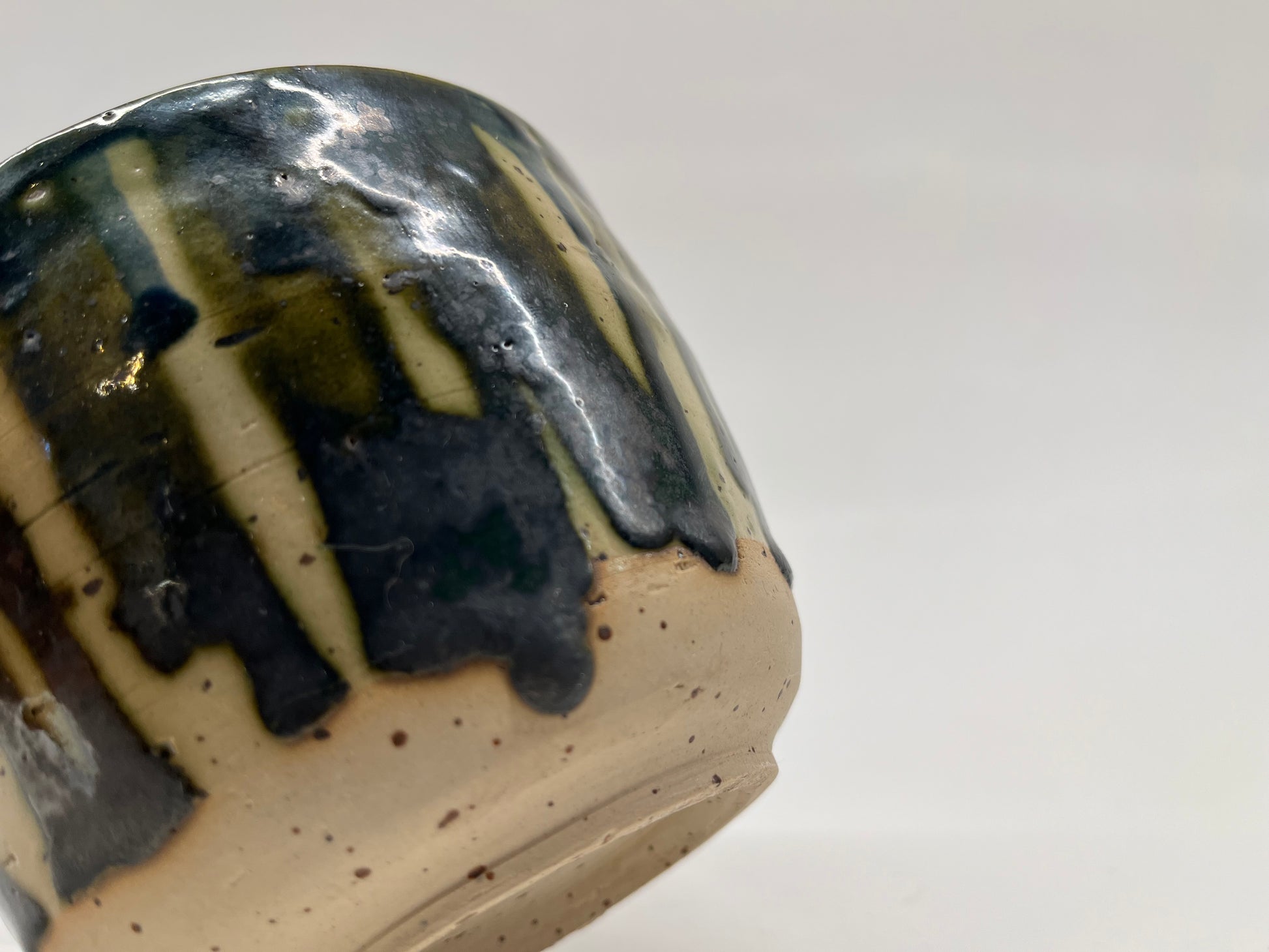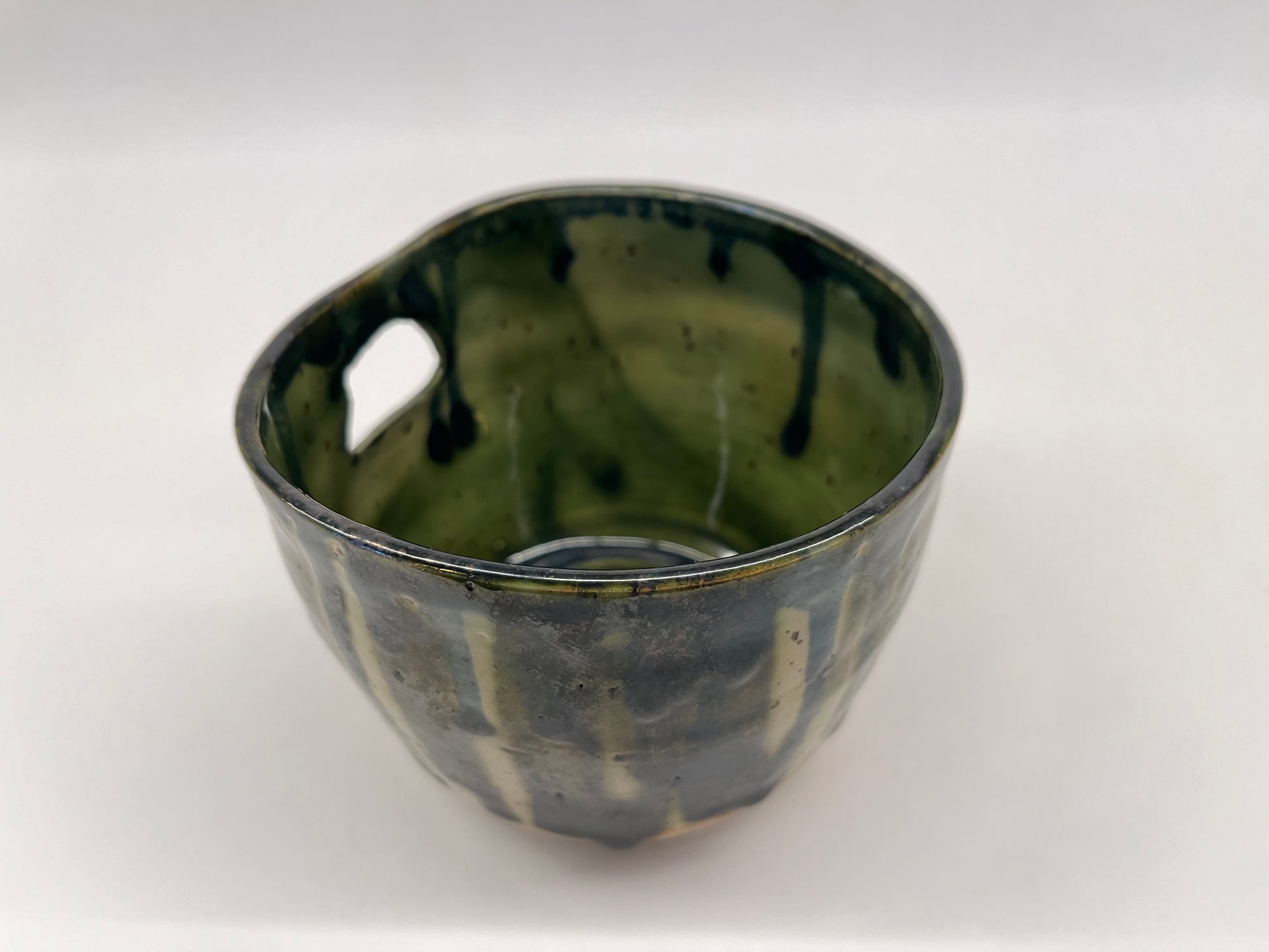 Drippy-glazed wall planter for small wall-hanging plants. Can hold plastic inner pots up to 10cm diameter. Dishwasher safe glaze.